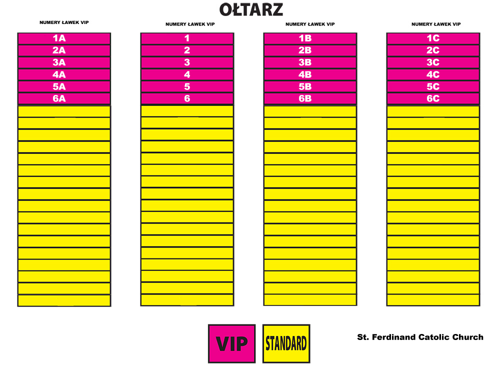 SEKCJA VIP (zaznaczona na różowo) – posiada numerowane ławki. Podczas zakupu biletu wybierz odpowiedni numer dostępnej ławki.