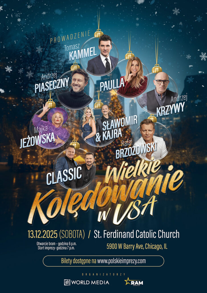 Ten wieczór upłynie pod znakiem najpiękniejszych kolęd w wykonaniu plejady polskich gwiazd. W sobotę 13 grudnia 2025 r. w kościele św. Ferdynanda w Chicago odbędzie się “Wielkie kolędowanie” podczas którego wystąpią: Andrzej Piaseczny, Paulla, Andrzej Krzywy, Majka Jeżowska, Sławomir & Kajra, Rafał Brzozowski, Classic. Koncert poprowadzi Tomasz Kammel.