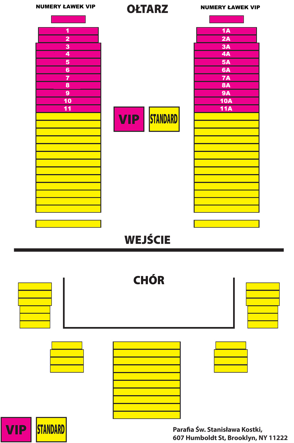SEKCJA STANDARD (zaznaczona na żółto) – ławki są nienumerowane. Uwaga: nie jest dozwolone zajmowanie miejsc dla nieobecnych osób (np. poprzez zajmowanie całej ławki lub jej części różnego rodzaju przedmiotami). Każda osoba, która posiada bilet, ma prawo usiąść na wolnym miejscu w sekcji, na którą wykupiła bilet